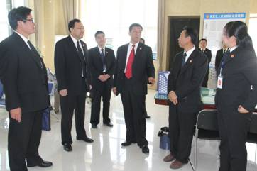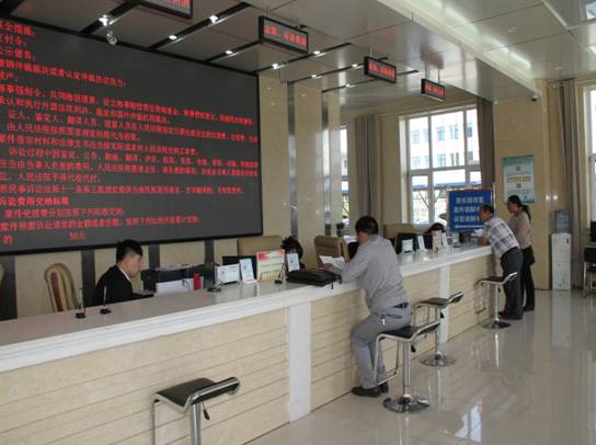 诉讼服务中心内文明引导员现场引导并告知当事人立案程序、帮助当事人正确使用案件流程查询系统、认真解析相关表格填写、为当事人提供饮水、复印文件等各项便民利民服务;大厅正中央LED电子屏滚动播放最新法律条文和司法解释;出票台、诉讼引导查询、立案绿色通道、立案司法救助、查询材料收转、刑事执行立案六大窗口工作开展井然有序;法律文书样式、桌椅纸笔、老花镜、多功能手机充电器、便民医药箱等便民服务设施一应俱全;大厅报刊架上放置最新报刊杂志供群众阅览,还陈列各类诉讼指南手册、记载西夏区法院各职能部门办公室电话、网上预约立案APP、裁判文书公开APP二维码和交通路线指示图的便民联系服务卡,以及2015年全区法院工作要点等一目了然;司法调解员充分发挥诉调对接前置功能,一如既往稳步开展诉前调解工作;“院庭长接待办公室”,值班领导党组成员、李节利副院长正在耐心为来访当事人做好判后答疑和释法明理及记录工作。
